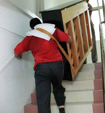 2、在用汽車作為運(yùn)輸工具時(shí),至少要四五個(gè)人才能完成,由于立式鋼琴的重心靠近后背,琴后背的人數(shù)要比琴前的人多,往汽車上抬時(shí),前面三個(gè)人,后面兩個(gè)人,后面的人抬起頂住,前面的人抬鋼琴的底部,抬起放到汽車上,然后上去一個(gè)人往車箱上拉,后面的人往車箱內(nèi)推,這樣就能把琴搬上車了。